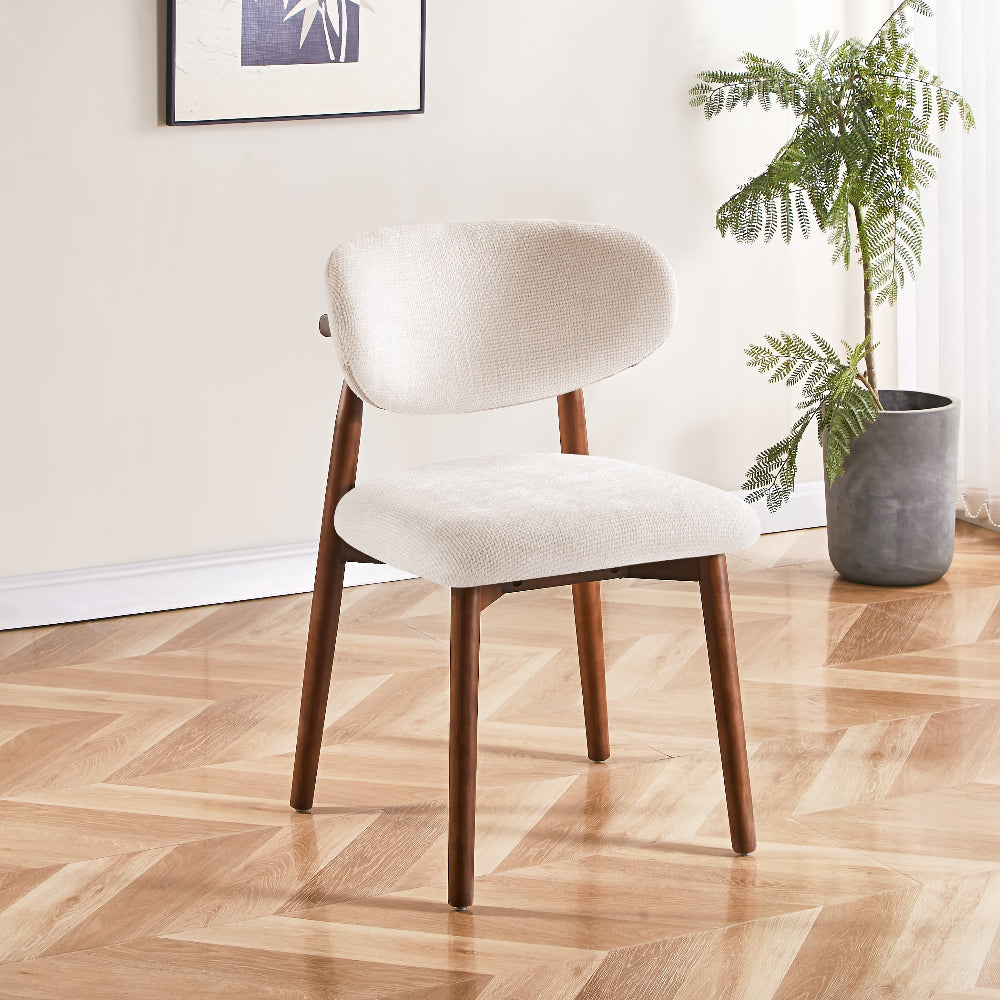 Verkrijgbaar in een prachtige gebroken wit kleur passen deze stoelen moeiteloos in elke interieurstijl. De hoogwaardige bekleding en de innovatieve japandi stijl maken deze stoelen niet alleen een visueel genot, maar ook een plezier om op te zitten. Creëer een uitnodigende en moderne eetruimte met deze veelzijdige en stijlvolle eetkamerstoelen.